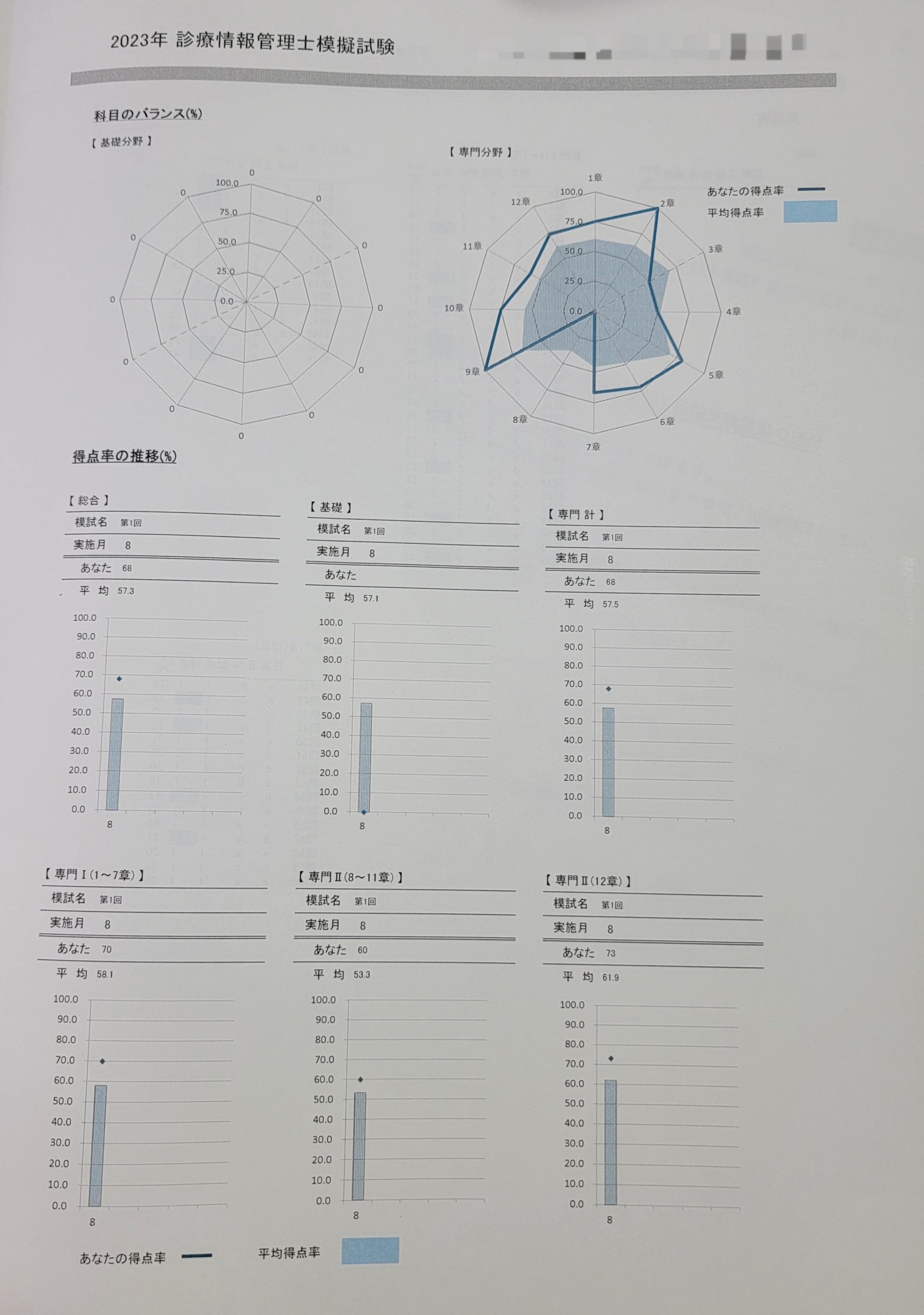 専門分野における第8章は0点と極端に成績が悪く、また第3章と第4章は平均点以下ということがこの図だけでも理解できます。